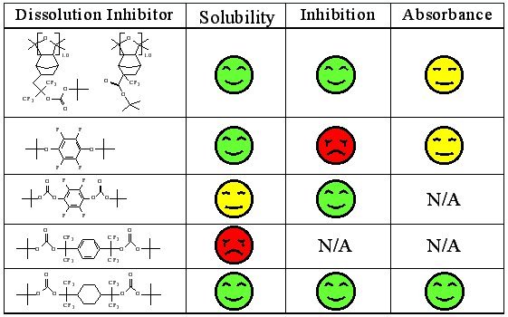 Dissolution Inhibitors Along with our work to create polymer structures for 157 photoresists, we have explored compounds as dissolution inhibitors. This approach will allow us to formulate a photoresist as a three-component system. Carbon monoxide copolymers are one of the component choices. We have synthesized and examined several compounds as the dissolution inhibitor properties. Recent dissolution inhibitor work: Poster displayed at the 2001 2nd Annual 157 Symposium in Dana Point: CANorbornene-Carbon Monoxide Copolymerization & Dissolution Inhibitor Study ACS SW Regional presentation: Dissolution Inhibitors for 157nm Lithography SPIE 2003: Dissolution Inhibitors for 157nm Lithography Below is a summary of the experiments.