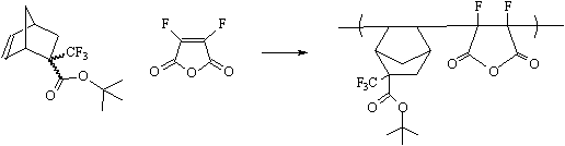 Free radical polymerization of alicyclics A second method of polymer formation with alicyclic monomers is through copolyermization with electron-poor comonomers such as malice anhydride. This was the basis of our research group’s 193 nm photoresist platform(9). Unfortaunely, such materials demonstrate high absorbance at 157 nm due to both the alicyclic and carbonyl subunits in the repeat unit. However, we have shown that the absorbance of the alicyclic unit can be attenuated by the addition of fluorine. We hope to apply the same method to decrease the absorbance of the maleic anhydride comonomer to allow this polymer class to be used as 157 nm photoresists. The preparation of difluoromaleic anhydride has been previously reported(10), and we are currently working to form the promising copolymer shown below.
