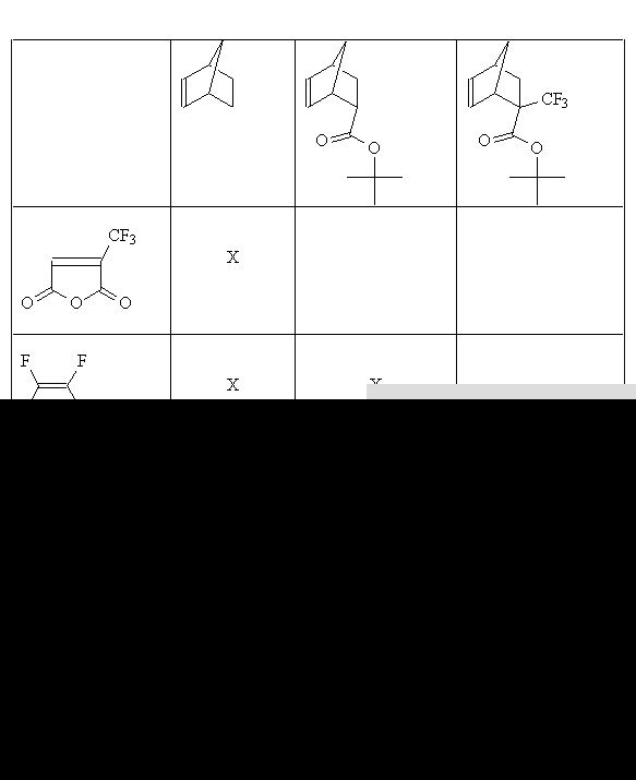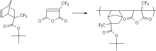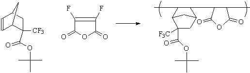 Free radical polymerization of alicyclics A second method of polymer formation with alicyclic monomers is through copolyermization with electron-poor comonomers such as maleic anhydride. This was the basis of our research group’s 193 nm photoresist platform(1). Unfortaunely, such materials demonstrate high absorbance at 157 nm due to both the alicyclic and carbonyl subunits in the repeat unit. However, we have shown that the absorbance of the alicyclic unit can be attenuated by the addition of fluorine. We hope to apply the same method to decrease the absorbance of the maleic anhydride comonomer to allow this polymer class to be used as 157 nm photoresists. The preparation of difluoromaleic anhydride has been previously reported(2), and we are currently working to form the promising copolymer shown below.