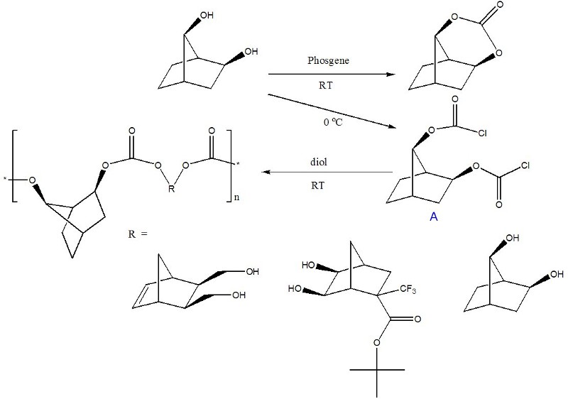 The purpose of this document is to provide timely public access to the 157 nm resist development work being done in our laboratories under contract from International SEMATECH. It is our goal and SEMATECH's goal to disseminate this information as rapidly and widely as possible in hope that doing so will accelerate the availability of 157 nm resist materials to the members of International SEMATECH. Condensation Polymers for 157 nm Photoresist MaterialsBrian P. Osborn, Ryan P. Callahan, Shiro Kusumoto, Charles R. Chambers Jr., Scott M. Grayson, Jacob R. Adams and C. Grant WillsonAs previously reported, our attempts to produce a condensation polymer by first making trans-diols of fluorinated norbornane epoxides were initially unsuccessful, instead producing cyclic carbonates and rearranged 2,7-norbornane diols (see original page). We have been able to use the acid-rearranged 2,7-diol structure to our advantage, trapping the dichloroformate of the diol at 0 °C (structure A). Using this dichloroformate and the cis-diol of choice, we were able to produce polycarbonates of the type seen below (Figure 1).