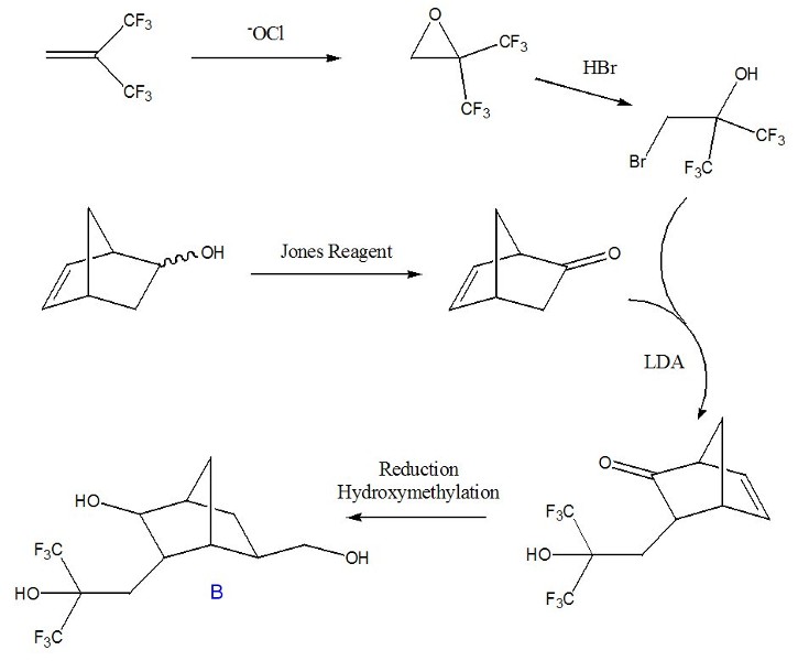Unfortunately, we were unable to effect similarly high-yielding rearrangements of substituted norbornane epoxides. Therefore, we are currently pursuing alternative means of synthesizing a fluorinated diol (structure B), as seen in Figure 2. We will attempt to produce a condensation polymer in an analogous fashion as in Figure 1 using this structure.