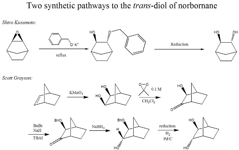 Our conventional efforts to produce a trans-diol from an epoxide were unsuccessful, but we are concurrently pursuing two different synthetic paths to produce the trans-diol of norbornane (Figure 3). The products of both pathways should show identical spectroscopic characterization, with a final X-ray resolved crystallography structure being conclusive proof of the final stereochemistry.