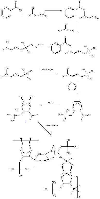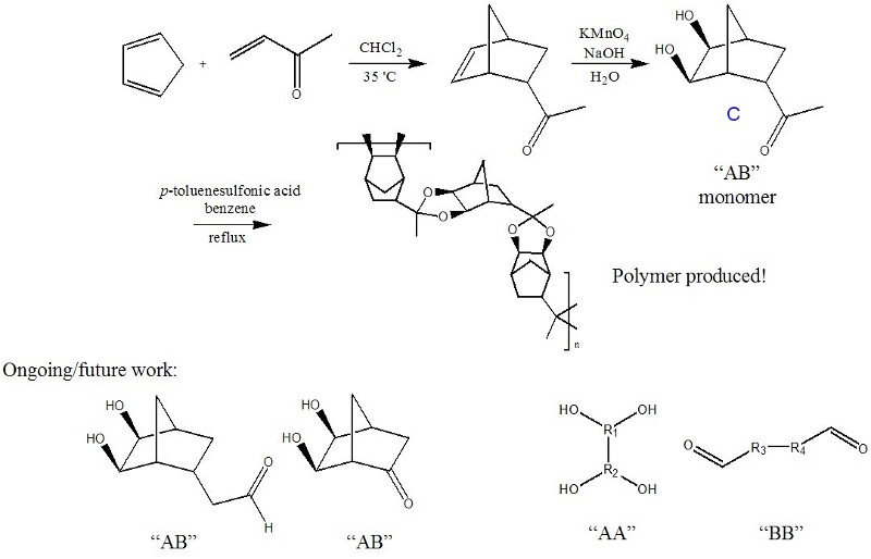Polyketals are another type of condensation polymer with interesting structures that may be accessible through the synthesis of norbornanes with both vicinal alcohols and a ketone present. This kind of .AB. monomer could self-condense, thus producing a condensation polymer that could include the highly fluorinated and transparent norbornanes we have so far been unable to polymerize by conventional means. Early work in this area with structure C has already produced a condensation polymer (Figure 4). There are other possible monomer structures of the .AB,. .AA. and .BB. type (Figure 4) that can lead to similar polymer structures.