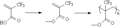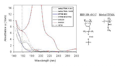 Acrylate polymers have been used extensively in 193 nm photoresist designs due to their facile functionalization and favorable polymerization characteristics(1). Unfortunately, the p-system in these polymers contributes a large amount of absorbance at 157 nm and effectively precludes their use at this wavelength. However, our research group has recently shown the absorbance of these materials can also be significantly decreased through the addition of electron-withdrawing substituents(2). For example, poly(methyl trifluoromethacrylate) was prepared from the commercially available acid(3), and polymerized according to literature procedures(4).