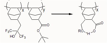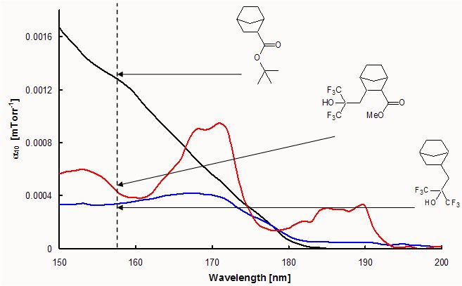 To examine whether the hexafluorocarbinol group would impart sufficient transparency to the monomer, a model compound was synthesized and examined via vacuum UV spectroscopy. Surprisingly, the addition of the hexafluorocarbinol imparts considerable transparency to the monomer. This result opens up a possible facile route to the inclusion of transparent ester-functionalized norbornenes and norbornene-like structures into metal-catalyzed addition and ring-opening metathesis polymers as well as free radical polymers, including copolymers with tetrafluoroethylene, to provide resist materials with modified dissolution behavior. A wide range of multi-functional norbornene and tricyclononene monomers (a few are illustrated below) are being explored for potential use as positive or negative tone resists for use in deep UV lithography.
