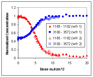 FTIR spectra were also taken at various doses prior to development to measure the amount of deprotection.
