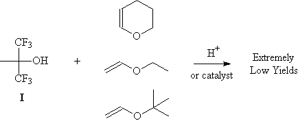 Development of 157 Photoresist Materials The purpose of this document is to provide timely public access to the 157 nm resist development work being done in our laboratories under contract from International SEMATECH. It is our goal and SEMATECH's goal to disseminate this information as rapidly and widely as possible in hope that doing so will accelerate the availability of 157 nm resist materials to the members of International SEMATECH. Protecting Group Module To gain an understanding of the appropriate methods for acetal protection of hexafluoroisopropanol moieties, a series of model studies was carried out using compound I. One common method of acetal formation involves treatment of an alcohol with a vinyl ether and a catalytic amount of acid (1). Unfortunately, the use of HCl or other acids as the catalyst for this reaction was completely unsuccessful at preparing the desired acetal. A catalyst reported to aid in the formation of acetals from tertiary alcohols, triphenylphosphine hydrobromide (2), was also found to be ineffective in this case. It is possible that a different catalyst might be capable of mediating this reaction, but we decided to pursue other methods.