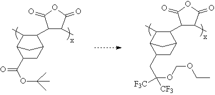 Functional test of hexafluoroisopropanol / acetal combination Although a successful method was found to readily protect hexafluoroisopropanol functionalities with acetals, it was not clear whether this combination would be an effective combination in a photoresist. Previous examples of hexafluoroisopropanols in photoresists consistently utilized tert-butyl carbonates for the protecting group, and therefore give no indication of what to expect with acetal protecting groups. As a result, the best method available to test the functional compatibility of these two moieties is to prepare a model photoresist polymer and evaluate the resulting lithographic ability. In order to change as few variables as possible, an existing polymer architecture developed for 193 nm photoresists and offering well-described lithographic behavior was modified to incorporate an acetal-protected hexafluoroisopropanol group.