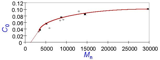 Figure 3 A series of experiments designed to test these predictions were conducted. Dissolution rates were measured as a function of base concentration for a set of low-polydispersity poly(hydroxystyrene) (PHS) samples of varying molecular weight. The dissolution rate was found to depend exponentially on concentration. The dissolution rates were extrapolated to 1Å/sec, the defined basis for the critical base concentration, c0. A plot of c0 versus the number-average molecular weight (Figure 4) shows that c0 increases with molecular weight, and c0 rises more steeply for samples having a molecular weight less than 10 000 than for higher molecular weight samples. In addition, if these data points are extrapolated to even lower molecular weights than those measured, the extrapolation intersects the concentration axis very close to the origin. Thus, the probabilistic model for f0 exhibits qualitatively all of the trends observed experimentally for c0.