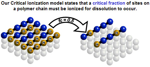 Development Most positive tone photoresists are based upon acidic polymers. These systems are developed in an aqueous solution of base (the most common developer solution is an aqueous solution of 0.26 N tetramethylammonium hydroxide). The dissolution of positive tone photoresists is different from the usual concept of polymer dissolution because the species in solution (a polyion) is different from the polymer in the film (a polyol). Chemical reactions of the basic developer solution with acidic sites on the polymer chains enable dissolution of the film. Our Critical Ionization (CI) model for the dissolution of phenolic polymers in aqueous base treats photoresist dissolution as a reaction-limited process in which a critical fraction of repeat units on a given polymer chain must be ionized before the chain becomes soluble in the developer solution. The input parameters to this model are fCRIT, the critical fraction of sites on a chain that must be ionized for dissolution to occur, and a, the fraction of all polymer sites exposed to developer that are ionized at equilibrium. fCRIT is a microscopic quantity that depends upon the chemical structure of the polymer. a can be calculated based upon the pKa of the resist polymer and the local concentration of the developer solution. More details on the CI model are provided elsewhere on this website. ![]() Recently, calculations have predicted the formation of an electric