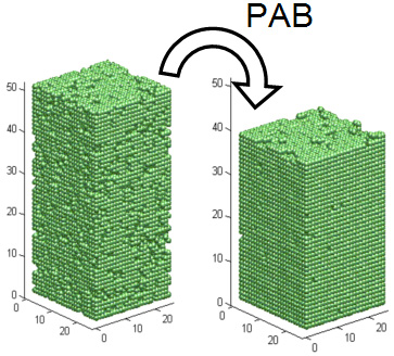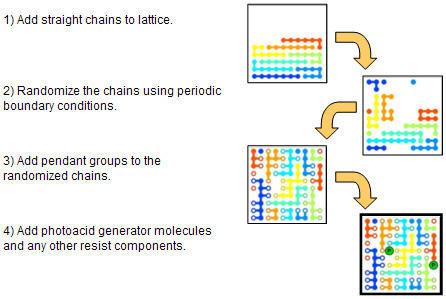 solvent, may be added in a similar manner. ![]() Click here to download a movie that illustrates how chains are added to an empty simulation lattice (15.7MB). After creating the resist model in this manner, the lattice approximates the configuration of the film after the spincoating step. It is then necessary to simulate the post apply bake (PAB) step. During the PAB, intermolecular interactions are important in the processes of solvent evaporation and film shrinkage. A Monte Carlo simulation is performed that allows the effects of specific intermolecular interactions to be considered. (Details of this simulation have been published, and the references are available on this website.) ![]()