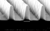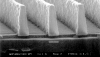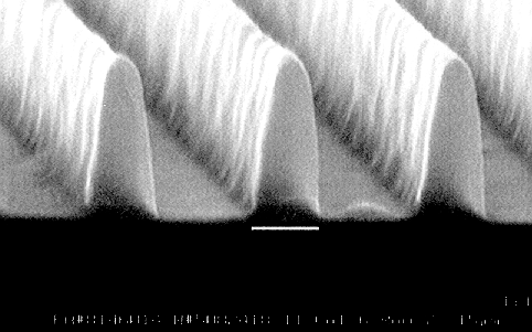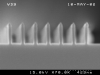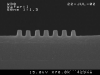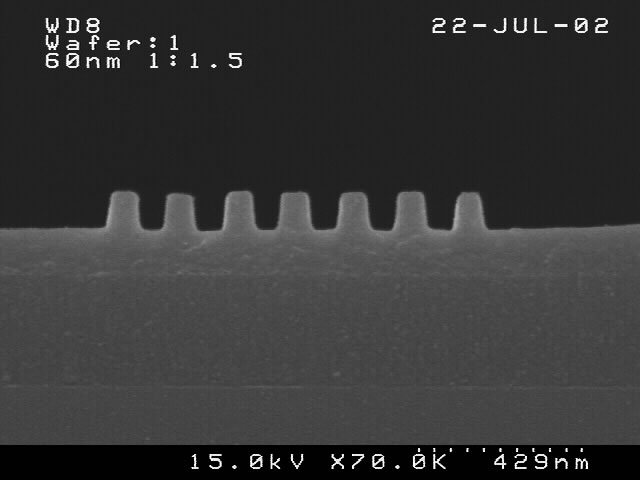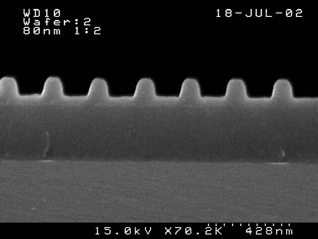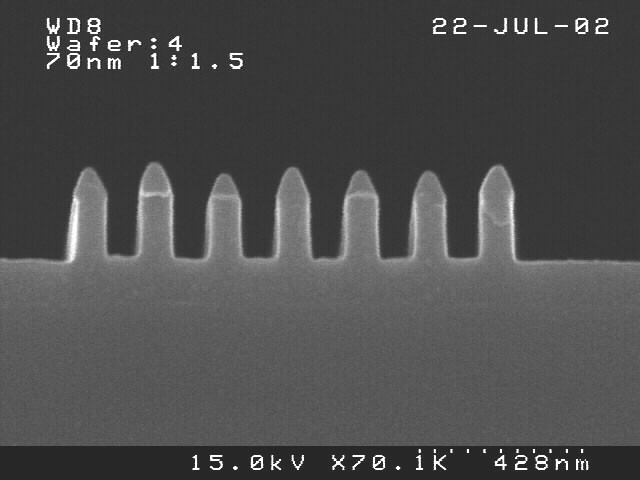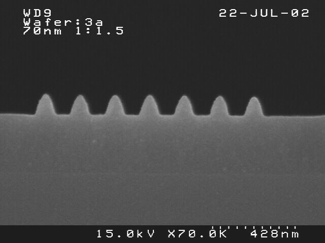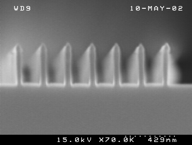 Figure 2. Etch transfer in action. a) Imprinted image with ~150 nm residual layer, b) part-way through breakthrough etch, c) after completion of breakthrough etch, d) part-way through transfer wtch, and e) after completion of the transfer etch. These are not from the same L/S array, since the samples had to be destroyed for SEM analysis. Figure 3e shows 40 nm lines approximately 400 nm tall. Figure 3. KrF resist images a) before and b) after ARC etch, showing the appearance of feature faceting arising from the anisotropic etch conditions. | |