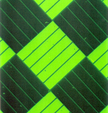 Single-layer Optical Devices An analog of the standard SFIL process flow was used to create a micropolarizer array. This process scheme was described in Colburn (SPIE 2000), and utilized a roller press in place of the traditional imprint apparatus. A sheet of polycarbonate with an array of orthogonal 100 nm lines/spaces was coated with a thin fluorocarbon film, and was used as the imprint template. Following imprinting and etch transfer, Ti was deposited at a rate of 2.5 nm/s in a metal evaporator. The substrate was immersed in an acetone bath and subjected to ultrasonication to remove the resist features, leaving the Ti that was adhered to the substrate. The result of this lift-off process was an alternating array of orthogonal metal gratings that comprised the micropolarizers shown in Figure 1. Figure 1a is an optical micrograph of the image illuminated through the backside with non-polarized light, and Figure 1b shows the array illuminated with polarized light. The visible thin lines in the square regions shown in Figure 1b are perpendicular to the direction of the Ti grating in that region, and serve to support the lines. It was thought that 100 nm resist lines at the aspect ratios used for the metal lift-off process might collapse if designed to extend the entire width of the 100 micron square. The polarization ratio for the device was measured to be between 5:1 and 10:1, but could be improved by redesign of these support struts.