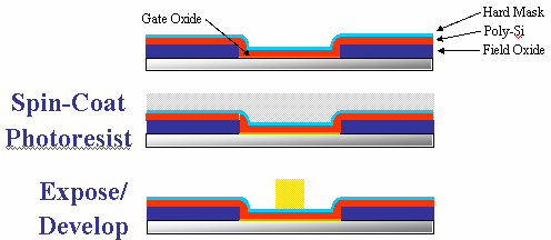 Patterning Over Topography In modern production processes, it is imperative that a patterning technique facilitate patterning over existing topography, since the substrates commonly posses at least marginal and sometimes extreme topography. Projection lithography has the ability to expose patterns among topography, as shown in Figure 1. SFIL requires a planar substrate on which to imprint, and so an imprint planarization step is added to the SFIL process flow, as shown in Figure 2.
