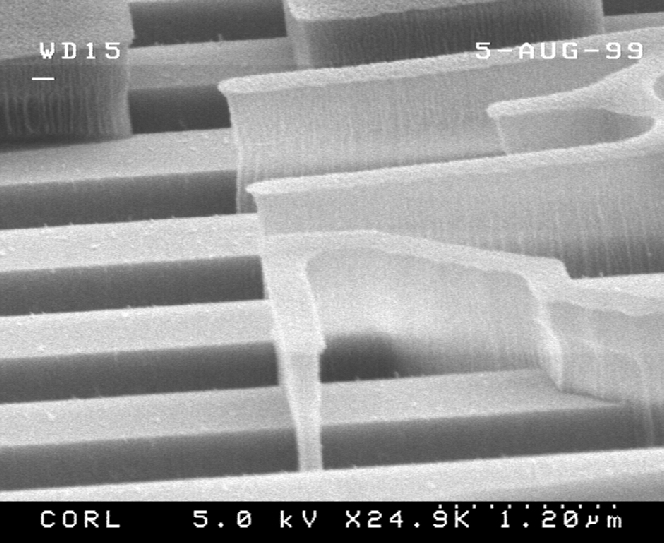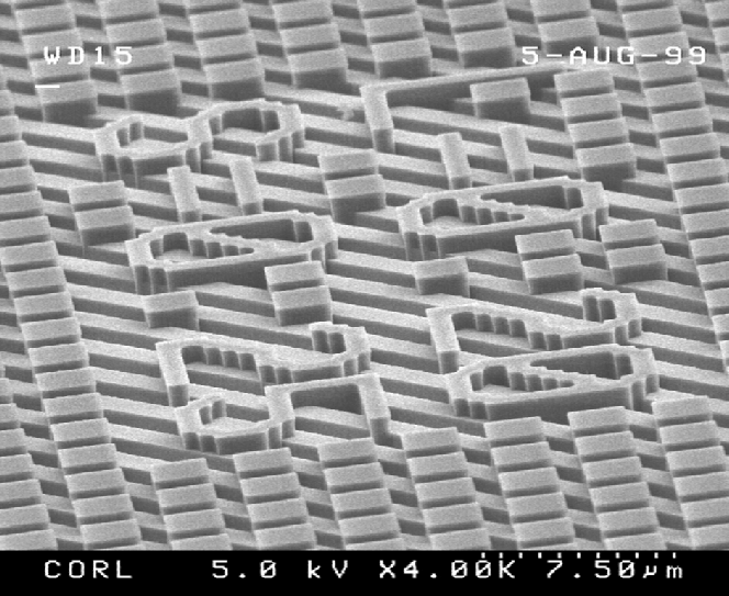 Figure 3. Examples of polymer features on extreme topography. The underlying line'space array is a 700 nm tall Fresnel lens in Si. | |