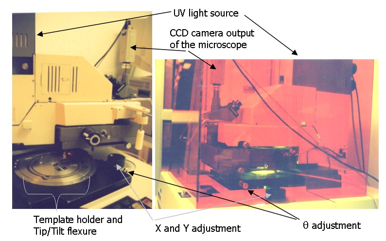 Alignment Machine The Overlay Alignment Machine (OAM) was developed to demonstrate layer-to-layer alignment with SFIL [Choi et al. 2001]. The OAM is a Canon 501 parallel light mask aligner, shown in Figure 1, that has been modified to implement a multilayer SFIL process. The original mask holder was modified to hold a low-profile 2-degree-of-freedom tip/tilt flexure with a mating SFIL template holder (see Figures 1 and 2). The bulk of the machine is below the level of the template holder; above the template holder is a microscope and exposure assembly. This assembly is used for the blanket UV exposure of the S-FIL process, and for looking through the template to align the features of the template to those on the wafer. The image of the features on the template and wafer are focused on a CCD camera, which is displayed on a monitor. The assembly is normally directly above the wafer/template stack, but can pivot to the side for removal of the template holder and the wafer. Figure 3.2 shows two views of the OAM – with the microscope and exposure assembly pivoted to the side (left) and directly over the wafer (right).