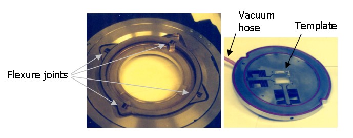 Figure 3.3. The S-FIL tip/tilt flexure assembly (left) and template holder (right). The lower parts of the machine contain the template and wafer holding and alignment assemblies. The template holder and tip/tilt flexure assembly can be seen on the machine in the left image of Figure 2. Figure 3 shows the template holder (right) and tip/tilt flexure (left) separate from the machine. The tip/tilt flexure is mounted to the frame of the machine above (and around) the wafer, wafer-chuck, and XY adjustment assemblies. The template holder assembly sits on the tip/tilt flexure and is held in place by a vacuum pulled in the outer margin of the template holder. The template is held in the template holder by set-screw-driven pistons. The wafer chuck is below the template holder, and is attached to an air piston by a spherical bearing. The alignment of the template to the wafer is done with the combination of passive and active elements. The wafer chuck is pushed upwards toward the template to imprint, narrowing the gap in the Z-direction by the air pressure in the air piston, and dampened by the etch barrier film between the template and the wafer. Rough alpha and beta alignment is achieved by a pre-calibration step utilizing the spherical bearing below the wafer chuck and the tip/tilt flexure. The wafer chuck is brought up and the top-side of a lower extremity of the chuck comes into contact with the bottom-side of the flexure ring. Fine alpha and beta alignment is achieved passively during imprinting with the tip/tilt flexure. The tip/tilt flexure was designed for selective compliance for passive alignment in the a and b motions, with the center of rotation at the template/wafer interface, with low deflections X, Y, and Z [Choi et al. 2001]. Theta is adjusted by rotating the template via the tip/tilt flexure and template holder assembly. The range of motion for theta is about 10 degrees, and continuous with no noticeable backlash. X and Y adjustment is done with the original mask-aligner mechanisms. This adjustment has +/- 0.1” range in X and Y and 0.5 micron resolution, and has no problem moving the wafer when it is in full fluid contact with the template. Submicron alignment has been demonstrated with this machine [Choi et al. 2001]. The machine is not capable of magnification or distortion corrections. The machine was not designed to have a high throughput - the OAM is designed to only imprint on the center of 4” wafers. There is the capability for XY movement of the wafer chuck relative to the template assembly, but the range-of-motion is used for layer-to-layer alignment only. There is only one microscope objective, so X,Y, and q alignment is an iterative process. For each imprint, the exposure and microscope assembly is pivoted to the side, the template holder is removed, a new wafer is placed on the wafer chuck, the monomer solution is dispensed, the template holder is put back in place, and the exposure and microscope assembly pivoted back to center. The placement of the wafer on the wafer chuck is important – the wafer must be placed within motion range of the X,Y, and q adjustments. The monomer solution is dispensed by hand with a micropipette, a process that allows for error in dispensed volume and drop placement. This machine has been used to pattern the gate level of a MOSFET device.