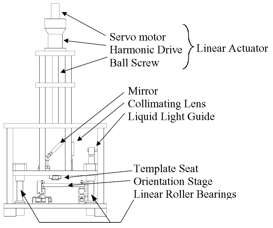 Figure 1. SFIL Imprint Press A linear actuator, consisting of a rotary brushless DC motor (Reliance Electric model #1843622004), a 1:160 gearhead (Harmonic Drive Technologies), and a 0.631 diameter 0.2 pitch precision ground ball screw (Thomson Saginaw) then slowly lowers the template until it rests directly above the Si wafer. The resolution, R, of the actuator in this configuration was calculated to be 0.02 mm/motor count. The use of a preloaded ball screw nut and harmonic drive minimize backlash. Other factors such as compliance of the harmonic drive, motor feedback errors, ball screw machining errors and thermal drift reduce the accuracy of the system to the order of tens of microns. The length of the ball screw allows the template seat to travel almost six inches from its lowest position to its highest position. This allows for easy installation of any future orientation stage designs and lets researchers raise the template to inspect or modify a template or wafer during a printing process. Once the template rests directly above the wafer, a UV-curable etch barrier is dispensed and fills the gap between the template and the wafer via capillary action. After the etch barrier fills the gap between the template and wafer, the linear actuator presses the template onto the wafer. The wafer is mounted on a compliant orientation stage that flexes to allow the orientation of the wafer to match the orientation of the template. A tripod arrangement of three force sensors below the orientation stage senses when the template and wafer make contact. After the template and wafer are pressed together, UV light illuminates the etch barrier. UV light from a Hg vapor lamp (Oriel) is directed through a liquid light guide into a collimating lens and onto a mirror, which directs the light downward through the imprint template and onto the wafer. After the etch barrier is cross-linked, the linear actuator separates teh template and wafer. The template and wafer may then be removed from the machine for inspection and further processing.