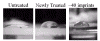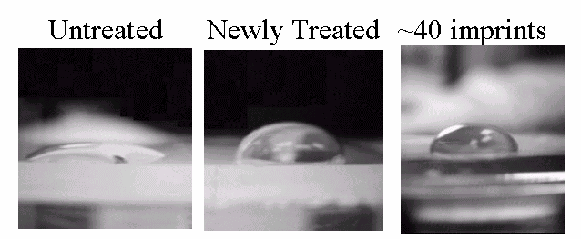 Figure 2. Water contact angle on an untreated template (left), a newly treated template (center), and a treated template (right) that was used to imprint numerous times. The template retained its release functionality, and it can be seen that the water contact angle did not change significantly. XPS analysis of the C region indicates that the film consists of as semi-fluorinated chain, and the C peak distribution is as would be expected from a film formes using this precursor, as shown in Figure 3.