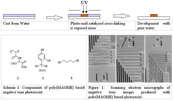 Aqueous Processable Positive and Negative tone PhotoresistsIntroductionSince the 1980’s, when studies revealed the health effects of exposure to ethylene-based glycol ether solvents, the search for alternative solvent systems has been a consideration of growing significance for resists vendors and semiconductor manufacturers. Propylene-based glycol ethers, lactic acid esters, and a host of other safe solvents have nearly completely supplanted ethylene glycol ethers as photoresist solvents since 1992, when the industry underwent a voluntary phase-out of their use. An additional concern for the semiconductor community is the emission of volatile organic chemical (VOC) vapors. This can become a financial factor as well as an environmental one as some microelectronics fabrication lines can be limited from producing at full capacity due to local restrictions on the amount of VOC’s that may be expelled through their ventilation systems. Furthermore, the growing costs of organic waste treatment and disposal contributes substantially to the cost of operating a microelectronics fabrication line. One approach to limiting the use of organic chemicals in the lithographic imaging processes is to investigate photoresists that can be fully processed with an aqueous media. During the past few years, our research groups have undertaken this approach and have developed a variety of environmentally enhanced resist systems. DesignsWe have developed a variety of photoresist systems in both positive and negative tone in collaboration with Professor Fréchet’s group at UC Berkeley. Our primary goal was to incorporate the means of solubility switching function into the system in order to create resist patterns on a silicon wafer after development. Regarding the negative tone systems, solubility of the film in exposed areas has to be decreased by some photochemical transformations. We have demonstrated this with either a photo-induced cross-linking reaction of poly(MAGME) or a polarity switch via Pinacol rearrangement. Regarding the positive tone, the design of an aqueous positive tone resist is particularly challenging because it requires incorporation of two solubility switches. All the components have to be soluble in water. Thus, the water-soluble formulation must be rendered insoluble by the casting process. We also have to incorporate a mechanism to render the film soluble again on the basis of some photochemical process during exposure. We have managed to achieve the initial insolubilization by either cross-link reaction of vinyl ethers or evaporation of ammonia or a combination of ammonia evaporation and decarboxylation. Negative Tone Resists1) Cross-link system with poly(MAGME) We reported a water castable, water developable negative tone resist based on the acid catalyzed cross-linking of poly(methyl acrylimidoglycolate methyl ether), 1, [poly(MAGME)](1), the components of which are depicted in Scheme 2. The water soluble sulfonium salt 2 was used to selectively produce acids in the exposed areas and 1,4-hexanediol 3 was used as a bifunctional “cross-linker.” Cross-linking results from a variety of mechanisms, including transesterification and alcoholysis of the aminal functionality. Resolution of 1 mm was attainable with this chemically amplified resist system. As can be seen in Figure 1, the resolution of this system was limited by swelling. While cross-linking provided the solubility differential required to define images, a more dramatic contrast in the hydrophilicity between the exposed and unexposed regions is necessary to prevent swelling with water development.