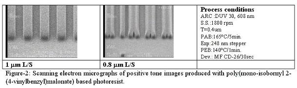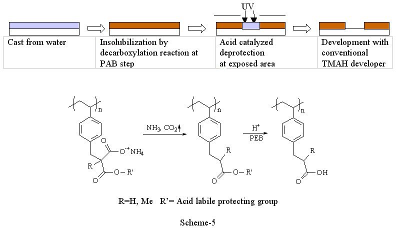 3) Decarboxylation system(6) The use of volatile ammonia was proved to be an effective way to increase the solubility of polymers in water. However, this method makes polymers too soluble when conventional TMAH developer was required to use. There are still some demands to use TMAH developer in industry because the development lines have been well established. Since TMAH is a stronger base than ammonia, the polymer is soluble in TMAH if the initial polymer is soluble in aqueous ammonia. Therefore, we need one more trick to render the film insoluble in aqueous base after casting. Scheme-6 shows an effective way to incorporate the double switching function into a photo-polymer that we recently explored. The styrenic polymer backbone was chosen for this design in order to provide sufficient dry etch stability. The ammonium salts of the half esters of malonic acids provide not only the initial solubility of polymer but also the insolubilization mechanism at post application baking via sequential volatilization of ammonia and decarboxylation. Once the film is insolubilized, photoacid-catalyzed thermolysis, the reaction commonly used in chemically amplified resists, renders exposed areas soluble in aqueous base developer providing positive tone images. The thermal stability of the acid labile protecting group is critical in order to obtain the double switching function. For example, tert-butyl ester decomposes during the decarboxylation process. Therefore, it resulted in poor imaging contrast. Isobornyl ester is more thermally stable than tert-butyl ester, and still cleavable with photo-acids. Polymers bearing isobornyl ester showed an excellent reaction selectivity between the decarboxylation and the thermal decomposition of the ester. Preliminary imaging of this system showed 1 mm resolution with 248 nm exposure and standard TMAH developer (Figure-2). Further modification of polymer structure, formulation, process conditions and detailed kinetic studies are in progress.