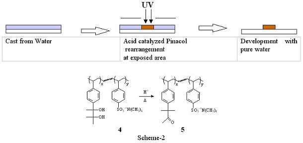2) Polarity Switch system with Pinacol Rearrangement(2) The concept behind imparting a solubility switch is based on hydrophilic chemical functions in the polymer that can undergo an acid catalyzed transformation resulting in hydrophobic products. Sooriyakumaran et al reported a resist design in which a hydrophilic polymer is converted to a more hydrophobic polymer using Pinacol rearrangement(3). Pinacol rearrangement is an acid catalyzed transformation of vicinal diols into corresponding ketones or aldehydes. Those researchers reported a polymer with pendant vicinal diols that is converted to more lipophilic polymeric ketones upon radiation induced generation of acid. Imaging was accomplished with the diol polymer. However, organic solvent was used as a casting solvent, and methanol was used as a developer because of solubility of the initial and the rearranged polymer. We adopted this chemistry as a switching function. Aqueous solubility of the polymer was increased by incorporating ionic moiety into the polymer as shown in Scheme-2. The copolymer ratio of the polymer 4 was adjusted to be near the threshold in the diol form such that the material is castable from aqueous solution and is rendered insoluble with minimal amount of transformation from the pinacol rearrangement. This system has not demonstrated high resolution imaging because of the availability of good water soluble I-line PAGs. However, the styrenic backbone provided excellent dry etch stability. It was found that this resist system was etched at 67 % the rate of conventional photoresist APEX-Eâ.