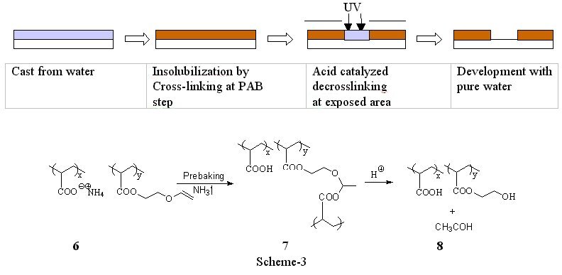Positive tone1) Cross-link/Decross-link system with vinyl ethers.(2) As previously stated, two solubility switches are necessary to accomplish positive tone imaging in a resist that is both cast from and developed with water. One way to accomplish the two solubility switches is to render the film insoluble by thermally induced cross-linking reaction via acid labile network such as acetals. Upon exposure to UV, photo generated acids cleave the acid labile cross-link site which generates a water-soluble polymer. Yamaoka et al. reported a photoresist system with “two solubility switches” using vinyl ether chemistry.(4) Organic base soluble polymer such as cresol novolak or poly(hydroxystyrene) is thermally insolubilized by the cross-linking reaction via an acetal formation between the acidic hydroxyl group and the vinyl ether moiety. We adopted this vinyl ether system into a water castable, water developable photoresist. We previously reported preliminary evaluation of the cross-linking and decrosslinking of poly(acrylic acid) with a monomeric bisvinyl ether additive in methanol.(5) We since modified this design to include a system in which the vinyl ether functionality is a pendant group on the poly(acrylic acid) backbone, and positive tone imaging that was cast from and developed with water was accomplished. Since carboxylic acids readily add to vinyl ethers in aqueous solution, the reactive carboxylic acids were “protected” as their salts. The ammonium salt copolymer, 6, is highly water soluble and casts high quality films. Upon PAB, ammonia was volatilized from the films and the corresponding free carboxylic acid was formed. The free acid quickly reacted with the vinyl ether groups to form acetals. This reaction cross-linked the film, 7, and rendered it aqueous insoluble, as is represented in Scheme 3. Photogenerated acid and water hydrolyze the acetals in the irradiated areas. The acid catalyzed “de-crosslinking” regenerated aqueous developable material, 8, and a gaseous by-product, acetaldehyde. The basic design has been verified and we have demonstrated positive tone images in a fully water processable photoresist. However, this positive tone resist has a variety of shortcomings. As expected, the plasma and reactive ion etch resistance of these materials is poor. A thin film of polymer 7, for example, etched at a rate over three times that of the commercial resist APEX-E®. The photoresist formulated with polymer 6 gave no images after 6 days even though the sample was stored in the refrigerator at 8 ºC. This indicates that the system is subject to a slow “dark reaction” and therefore have limited shelf life.
