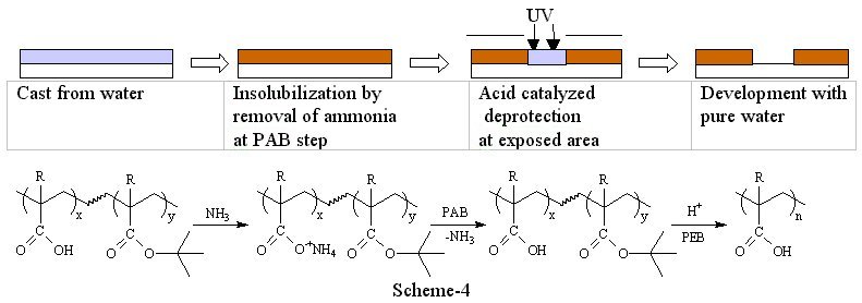 2) Polarity switch system with evaporation of ammonia Havard et al proposed an insolubilization mechanism using volatile amines(5). For example, ammonia was added to a water insoluble acidic polymer. The acid forms an ammonium salt which increases aqueous solubility of the polymer. Upon PAB, ammonia is evaporated such that the polymer returns to original insoluble form. Once the polymer film is insolubilized, photoacid-catalyzed thermolysis, the reaction commonly used in chemically amplified resists, renders exposed areas soluble in aqueous base developer providing positive tone images.